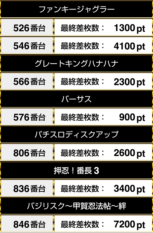 『ファンキージャグラー』の546番台は4000ptを上回り、836番台の『押忍!番長3』には3000pt以上のデータが残っていた。