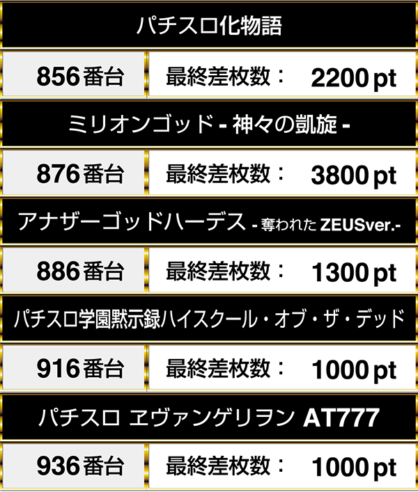 ほかにも、856番台の『パチスロ化物語』や886番台の『アナザーゴッドハーデス-奪われたZEUSver.-』など、随所にこの日をプラスptで終えている台があった。