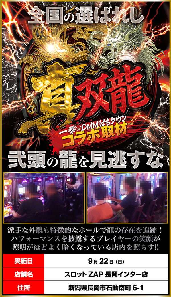 弐頭の龍の存在を追い求めて、パチスロ専門店の「スロットZAP長岡インター店」で「真双龍」をおこなった。