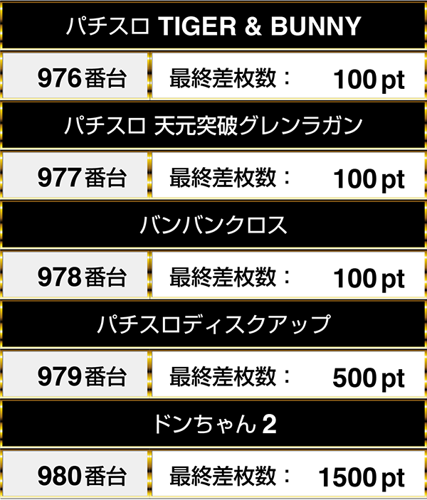 バラエティコーナーにある976番台の『パチスロ TIGER & BUNNY』から980番台の『ドンちゃん2』までの5台が並んでプラスpt!