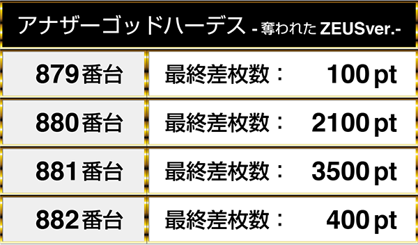 『アナザーゴッドハーデス-奪われたZEUSver.-』は4台すべてがプラスptを記録し、そのうちの2台は2000ptオーバー!!