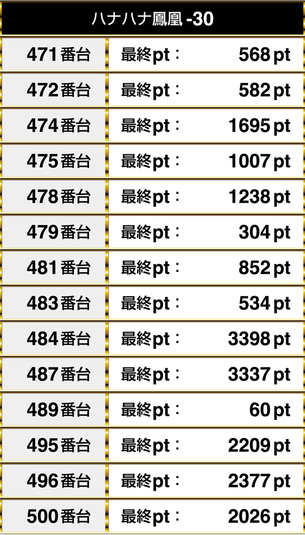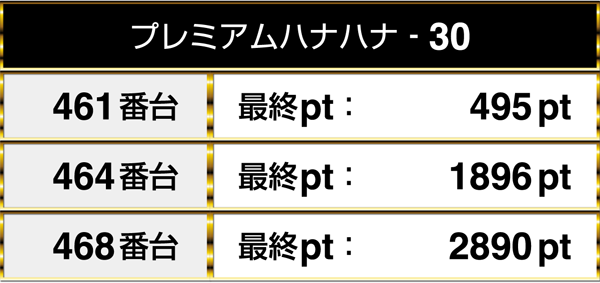 『プレミアムハナハナ‐30』は2000pt以上を含め、3台がプラスptでこの日を終えていた。