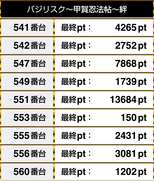 『バジリスク~甲賀忍法帖~絆』は20台のうち9台がプラスpt。なかには10000pt以上のデータも残っていた。