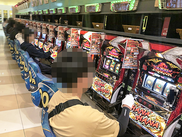 開店直後は20円パチスロの「ツインドラゴンハナハナ‐30」を中心に、次々と席が埋まっていった。