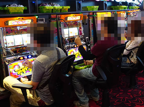友人同士で遊技をおこなう台を探したり、談笑していたりと、楽しそうなシーンが多い店内で、「ニューパルサーSPⅡ」のプレイヤーもつねに笑顔。パチスロのおもしろさを心から堪能できていると感じた。