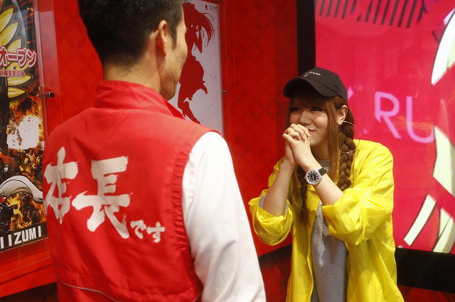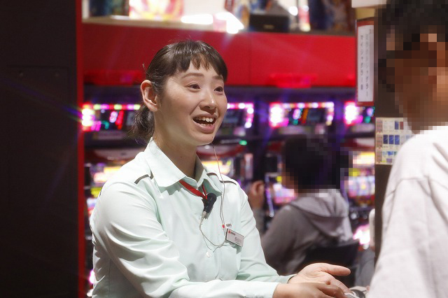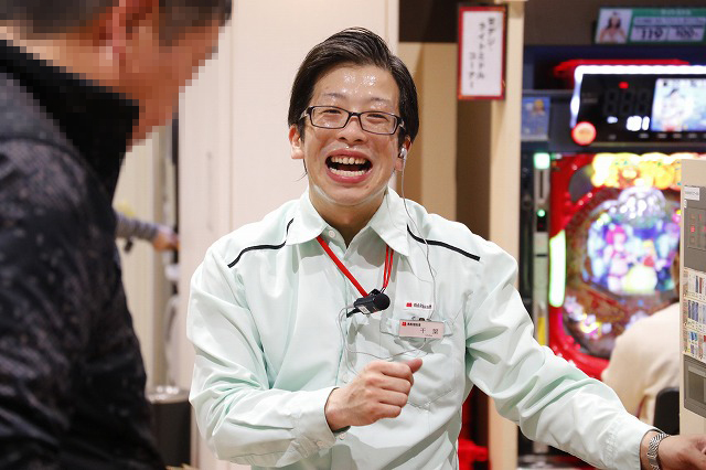 圧倒的な出玉感を見せつけられた山崎ひびきは、新店長の本気に感動した様子。