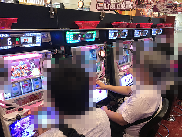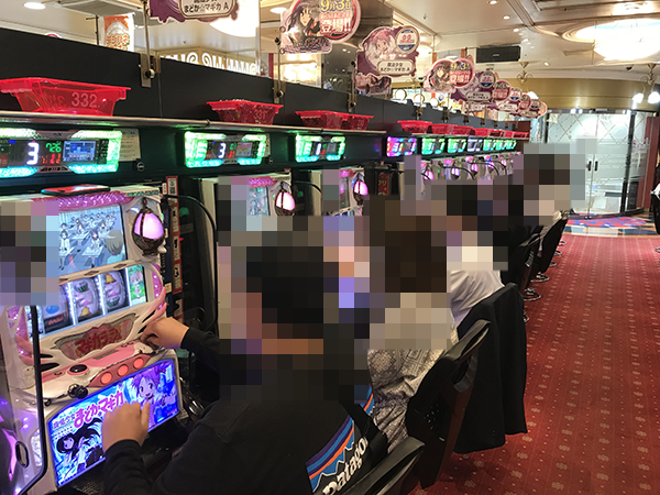 ホール内をぐるりとみてまわったあとにもう一度、確認しても稼働率の高さと盛り上がりの大きさが変わらず、どのタイミングでもにぎわいを感じた。さまざまな機種で楽しげな光景を目にしたが、とくに活気づいていたのはやはり「SLOT魔法少女まどか☆マギカ」だ。