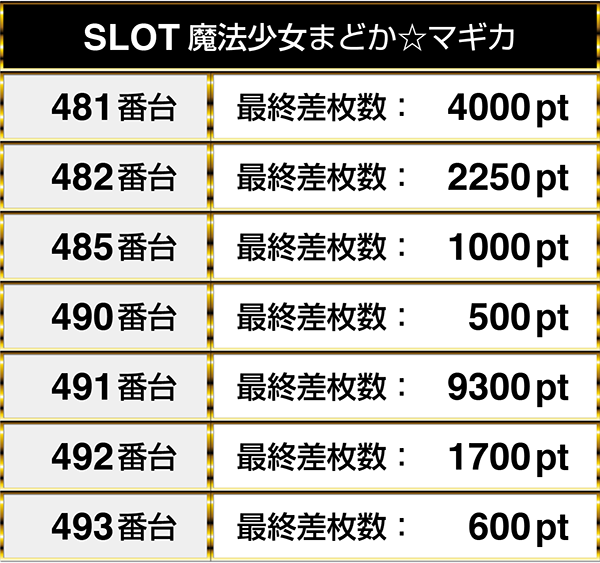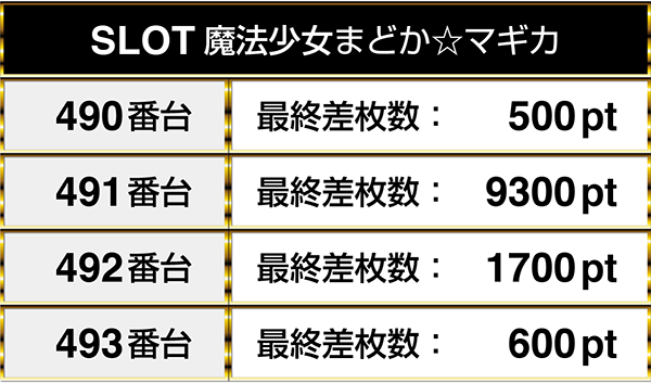 『SLOT魔法少女まどか☆マギカ』の4台が並んでプラスptを記録し、そのうちの1台は9000ptオーバー!