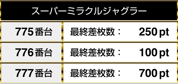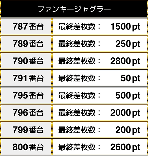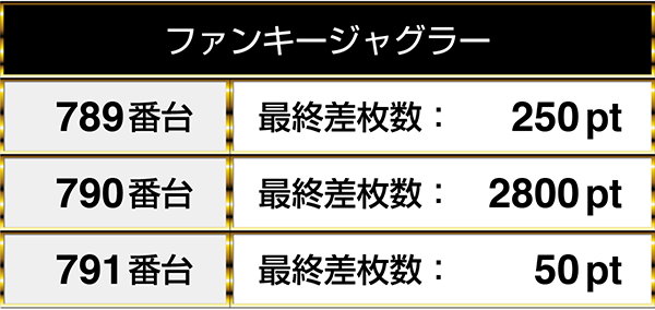 『ファンキージャグラー』は16台中8台がプラスptとなり、そのうちの4台は1000pt以上!!