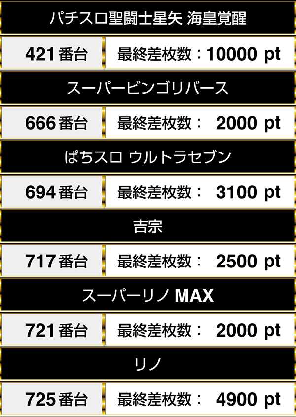 『ぱちスロ ウルトラセブン』が3000ptを上回り、『リノ』は4000pt以上でこの日を終えていた。