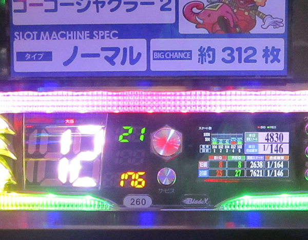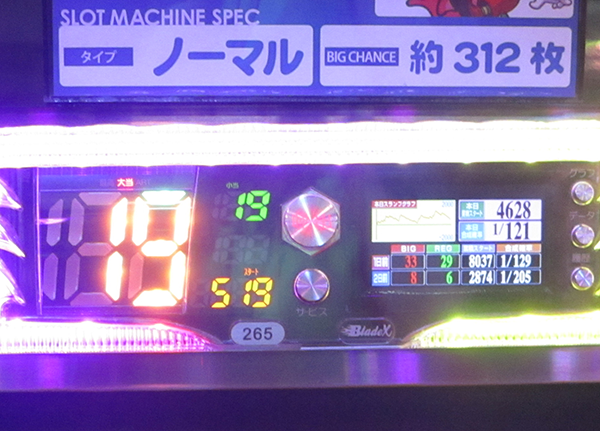 遊技を満喫しているような姿だけでなく、4628Gを消化した時点で38回のボーナスを獲得している台も確認。
