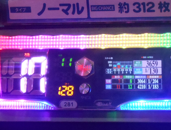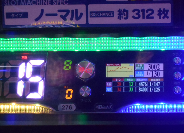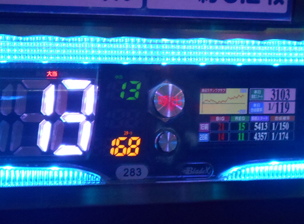 データカウンターをみると、1/130以上のボーナス合算確率が3台。そのうちの1台はBIGとREGを13回ずつ獲得と、バランスよくボーナス回数を伸ばしていた。