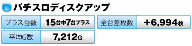 15台中7台がプラスで全台差枚数は+6,994枚。