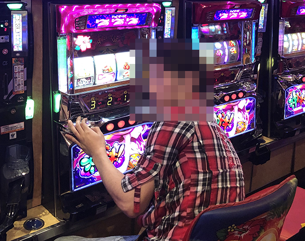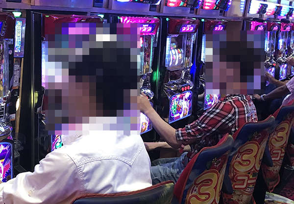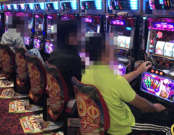 パチスロコーナーをみわたすと、遊技を満喫しているような姿が多数。茶色を基調とした店内の落ち着いた雰囲気とは対照的に、各所がにぎわっていた。