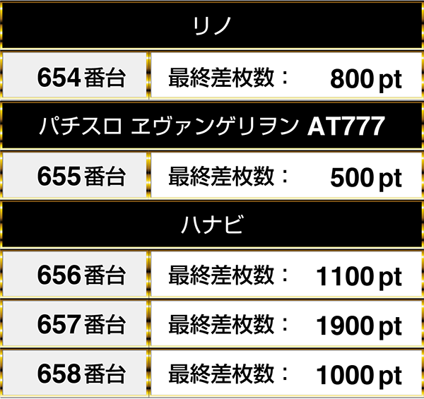 最終的には『リノ』と『パチスロ ヱヴァンゲリヲン AT777』、『ハナビ』の3機種を通して、5台が並びながらプラスptを記録していた。