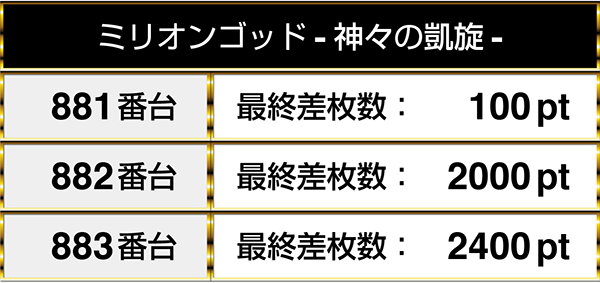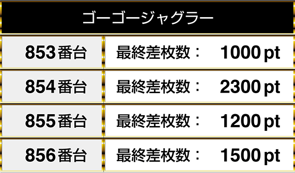 1日を終えた時点で『ゴーゴージャグラー』は4台が連なってプラスptを記録し、すべてが1000pt以上。
