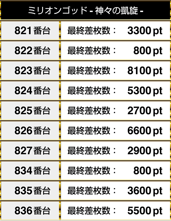 最終的には、821番台から827番台までと834番台から836番台までが連なってプラスpt。そのうちの8台は2000ptを上回る!!