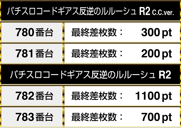『パチスロコードギアス反逆のルルーシュR2 C.C.ver.』と『パチスロコードギアス反逆のルルーシュR2』は2機種を通して、4台並びでプラスptを記録した。