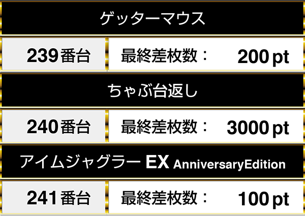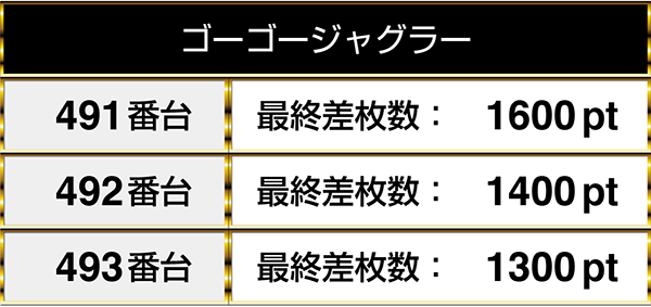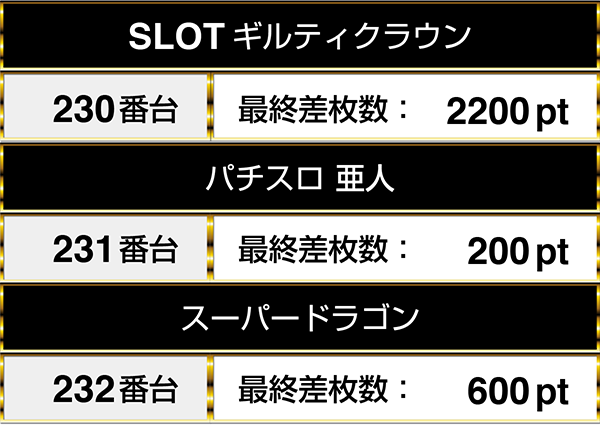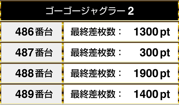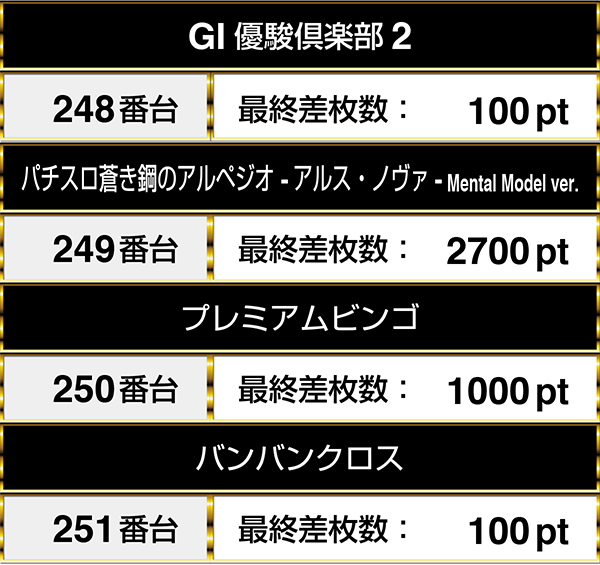 閉店時には、『GI優駿倶楽部2』から『バンバンクロス』までの4台が連なってプラスpt。3台が並びながらプラスptでこの日を終える場所もあった。