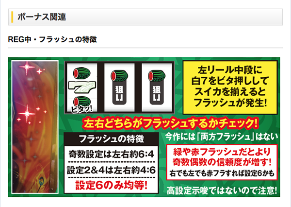 また、REG中にスイカを揃えると発生するサイドランプのフラッシュにも、設定示唆が存在する。