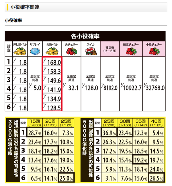 高設定ほど確率が高い共通ベルをカウントしよう。状態を問わずにサンプルを集められるため、設定推測のメイン材料となる。