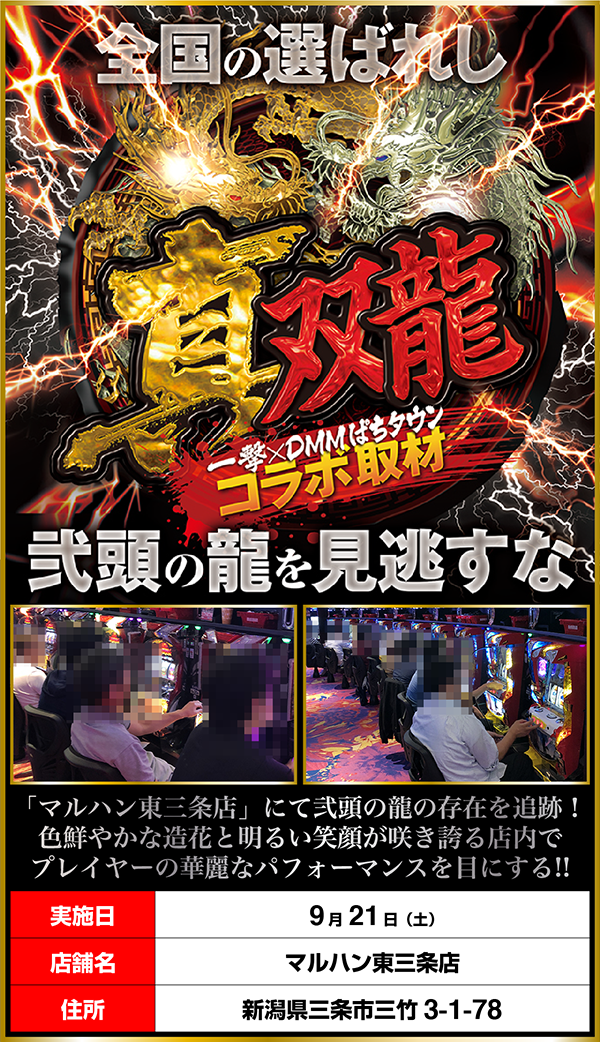 「真双龍」の舞台となったのは、銀色の装飾があしらわれた外観も特徴的な「マルハン東三条店」。