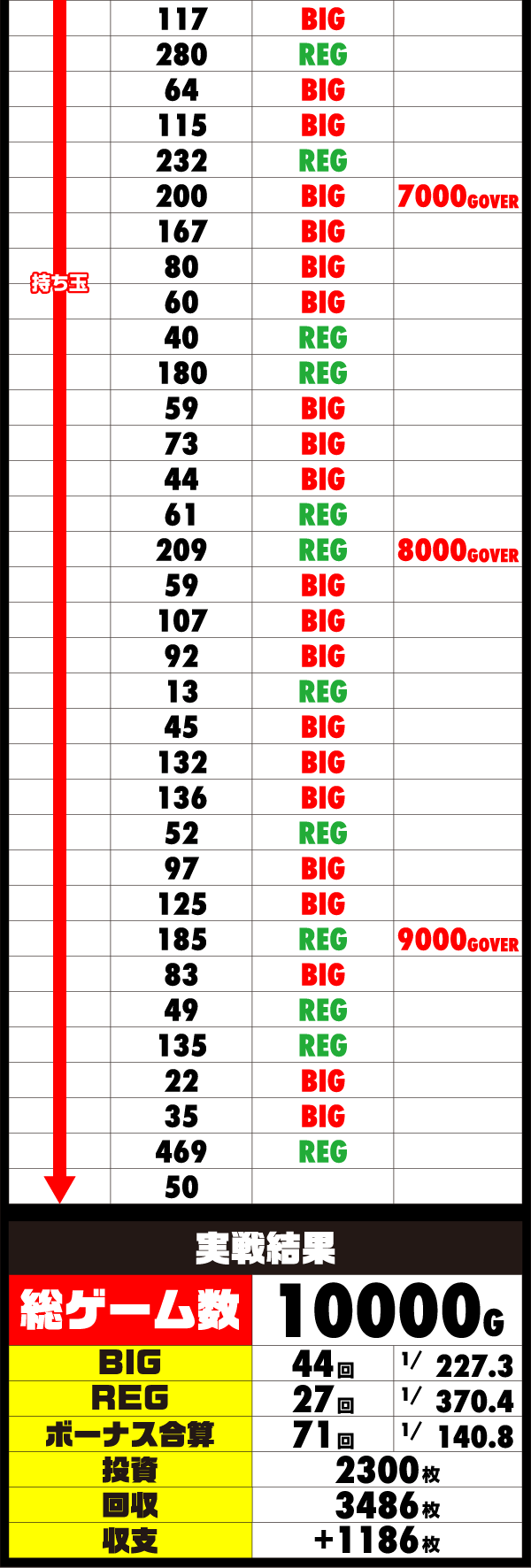 午後にはいってからはボーナスを獲得する勢いが増していき、出玉も順調に増加。ボーナス消化によるタイムロスはあったが、午前中にしっかりとゲーム数を稼いでいたおかげで夕方頃には6700Gを通過した。
