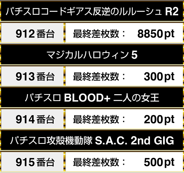 『パチスロコードギアス反逆のルルーシュR2』から『パチスロ攻殻機動隊S.A.C. 2nd GIG』までの4機種が連なってプラスpt記録!!