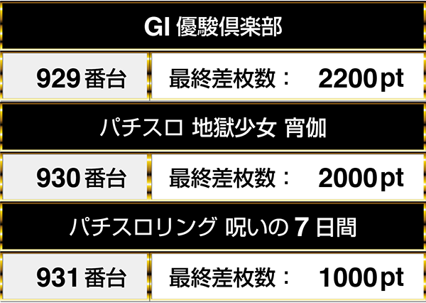 『GI優駿倶楽部』と『パチスロ 地獄少女 宵伽』、『パチスロリング 呪いの7日間』は、3機種を通してプラスptとなっていた。