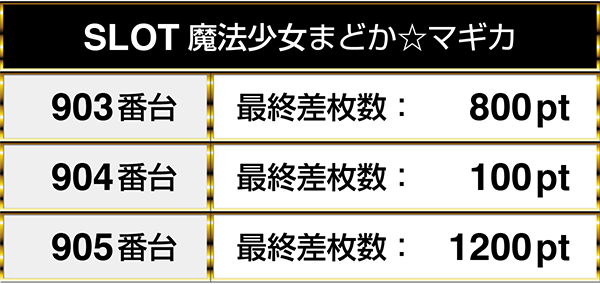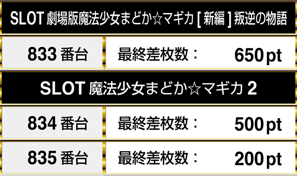 閉店時には、となりに置かれた『SLOT魔法少女まどか☆マギカ2』を通して3台並びでプラスptを記録。