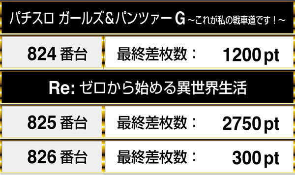 『パチスロ ガールズ&パンツァーG~これが私の戦車道です!~』の1台と2000ptを上回るデータが残っていた『Re:ゼロから始める異世界生活』の2台が連なってプラスptを記録。