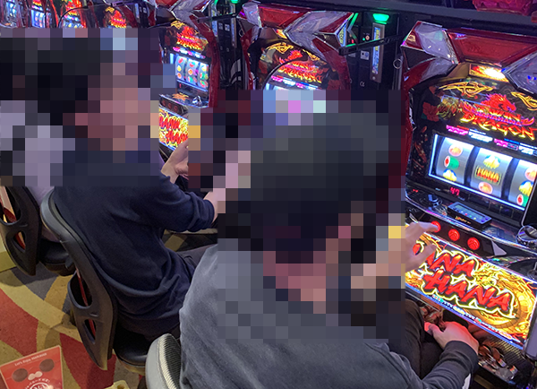 2つのシマに向かい合わせで25台が設置されており、どちらのシマも輝くような笑顔で埋め尽くされていた「ツインドラゴンハナハナ‐30」だ。