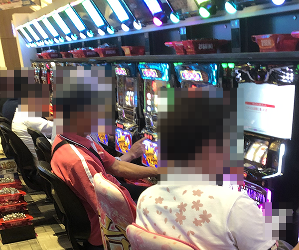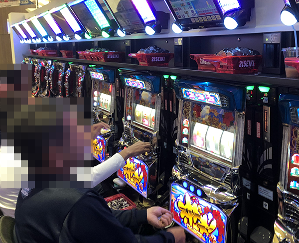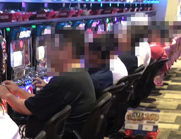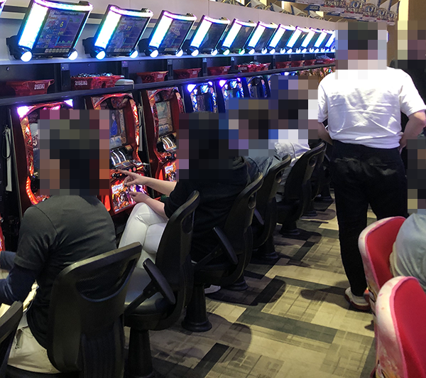 店内をみわたすと、パチンコもパチスロも高稼働。さまざまな場所が活気づいているなかで、パチスロコーナーがとくに大きくにぎわっていた。