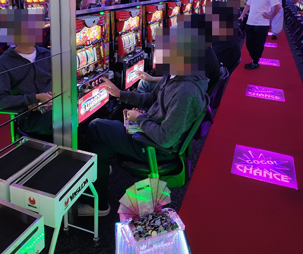 白いフローリングのパチンココーナーと天井にカラフルな電飾がほどこされているパチスロコーナーの両方で笑顔を目にしている。