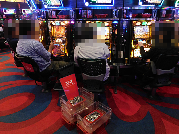 18時半ごろにホール内をみてみると、パチンコとパチスロの各シマに、大名級の存在感を放っているプレイヤーの姿があった。