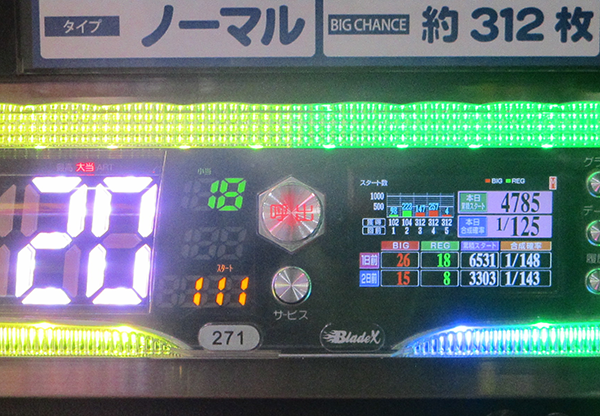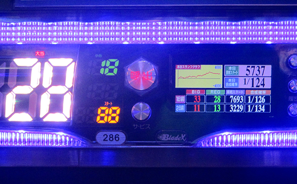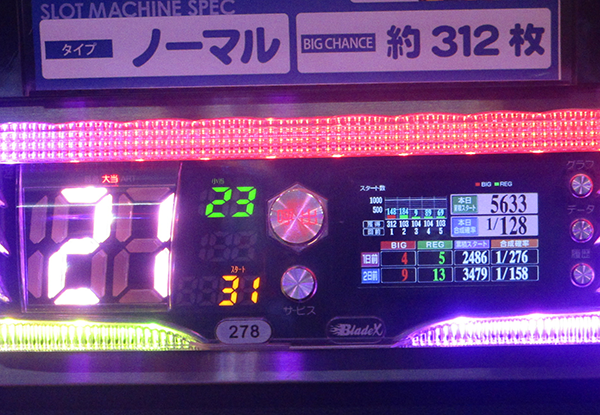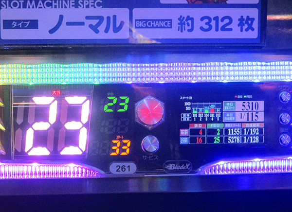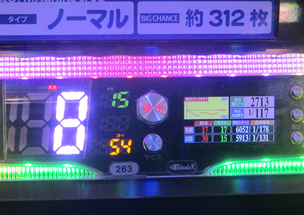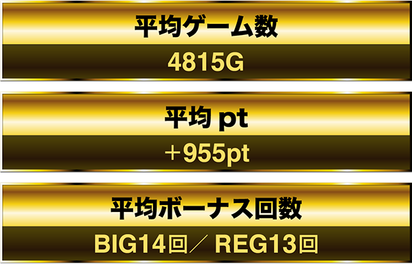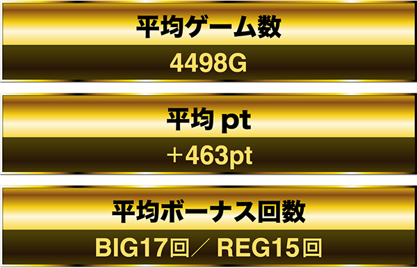 1日を通した平均ゲーム数は4498G。平均ボーナス回数はBIGとREGをあわせて約32回であった。