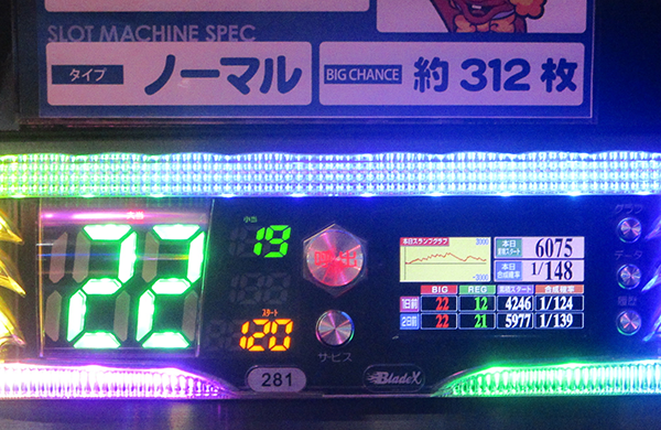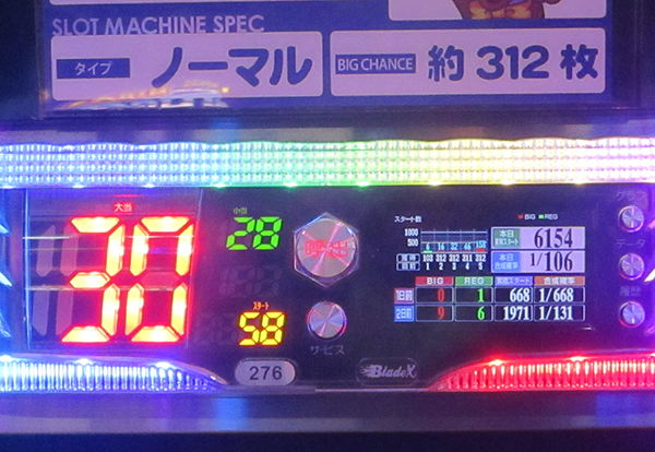 18時頃にデータカウンターをみると、6台が30回以上のボーナスを獲得。そのうちの5台はボーナス合算確率が1/130を上回っていた。