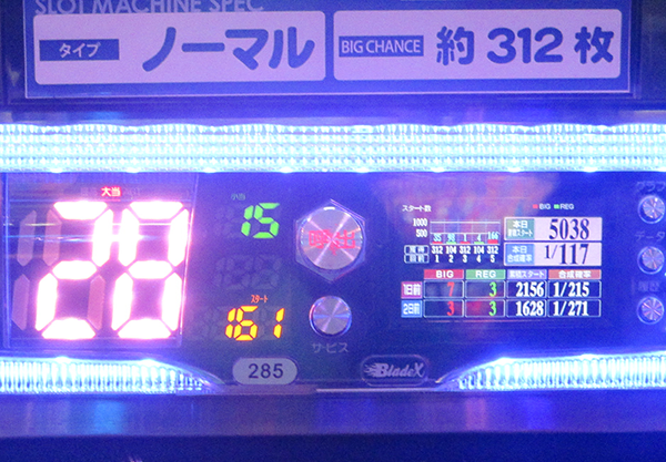 18時の時点では、3台のボーナス合算確率が1/130以上。2台はBIGとREGをバランスよく獲得していた。