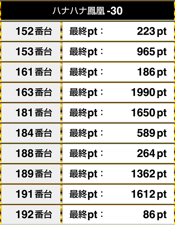 『ハナハナ鳳凰-30』の10台がプラスptを記録し、4台が1000pt以上!!