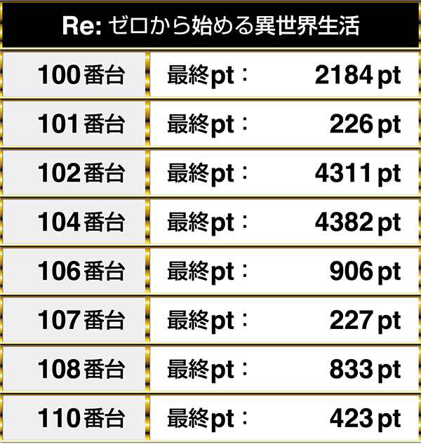 4000ptオーバーの台があった『Re:ゼロから始める異世界生活』は、14台のうち半数を上回る8台がプラスptを記録!
