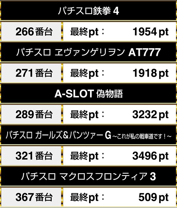 『パチスロ ヱヴァンゲリヲン AT777』は最終的に1000pt以上、『A-SLOT偽物語』と『パチスロ ガールズ&パンツァーG~これが私の戦車道です!~』においては3000ptオーバーを記録!