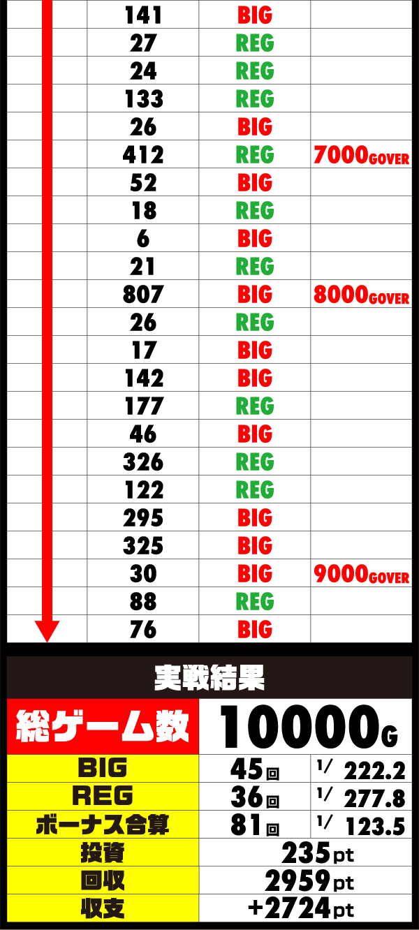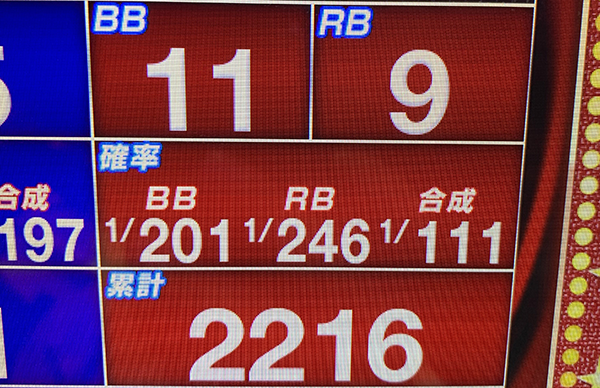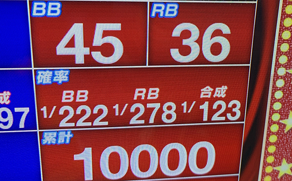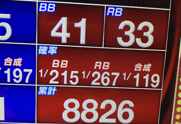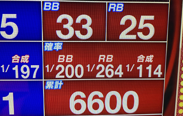 後半戦にはいってからも着々とゲーム数を伸ばしていき、18時の時点で6600Gを突破。獲得したボーナス回数は50回以上と、あらゆる面が順調そのものだ。