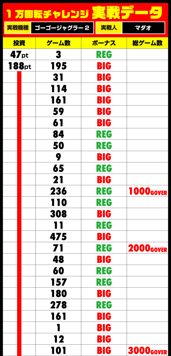 狙っていた「ゴーゴージャグラー2」で挑戦をはじめると、序盤からテンポよくBIGとREGをゲット。ボーナスを消化する時間に苦戦しながらも、12時頃には2200Gを通過と1万回転に届くペースでゲーム数を稼いでいた。