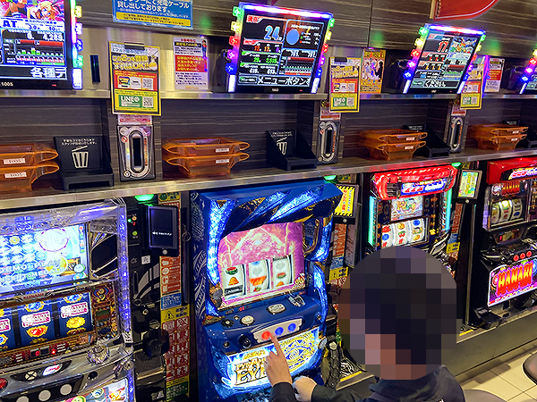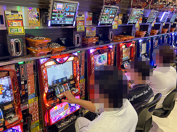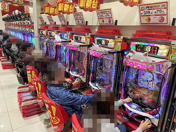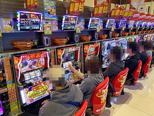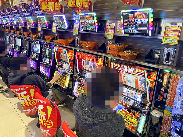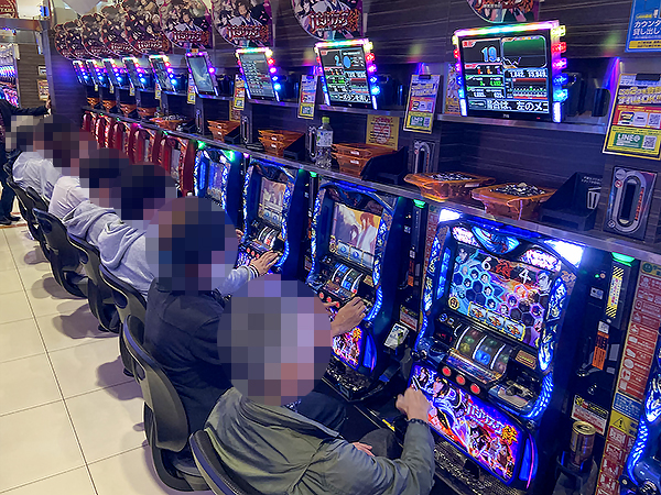 14時ごろの店内を見てみると、20円パチスロの「闘魂継承 アントニオ猪木という名のパチスロ機」や「S呪怨 再誕AT」が人気で、すぐさま満席となっていた。