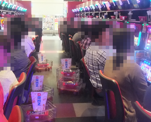 パチスロの各台の上部にはゴミを置くスペースが備えられている。スタッフが回収している場面もあり、プレイヤーたちは手元がすっきりとした状態かつ席を離れずに遊技を楽しみ続けられると思った。