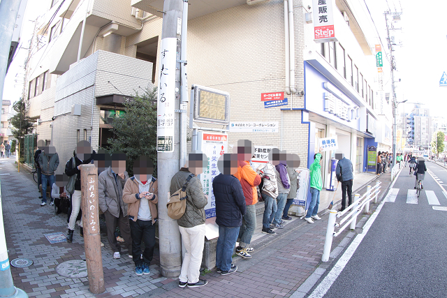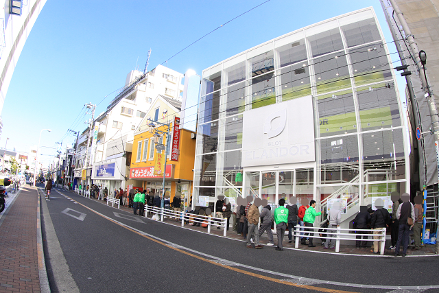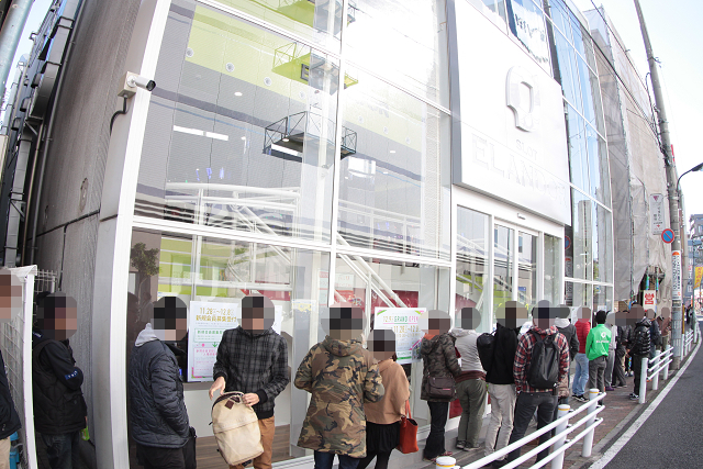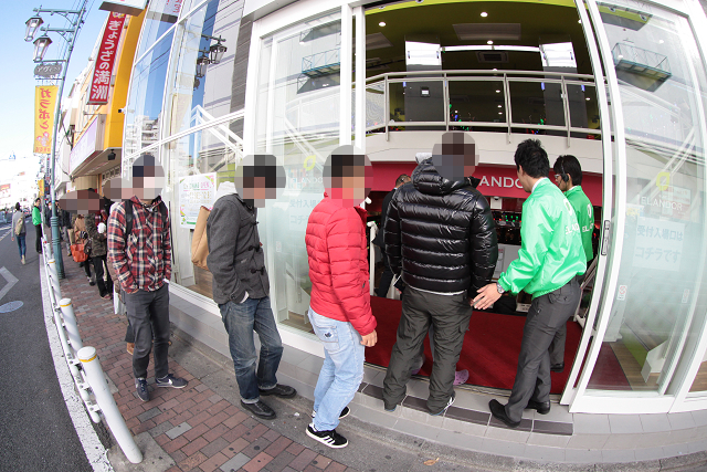 さて、そんな我々を出迎えたのは、今や遅しと店舗前で受付開始を待つ長蛇の列! 会員登録と同時にグランドオープン期間の入場順番券配布とあって、やはりにぎわってますね〜!! 最後尾はいったいどこだ!?