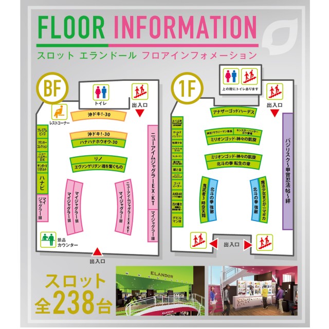 ライトグリーンの1Fは正面右手の壁際が端から端まで『バジリスク〜甲賀忍法帖〜絆』! その他『北斗の拳 強敵』などAT機・ART機が中心の構成で、バラエティコーナーも充実しています。