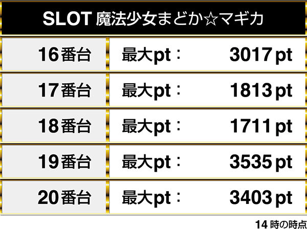 おなじく、満席の『SLOT魔法少女まどか☆マギカ』は設置されている5台すべてが1000pt以上であり、そのうちの3台は3000ptを上回っていた。