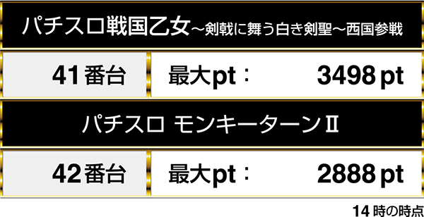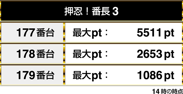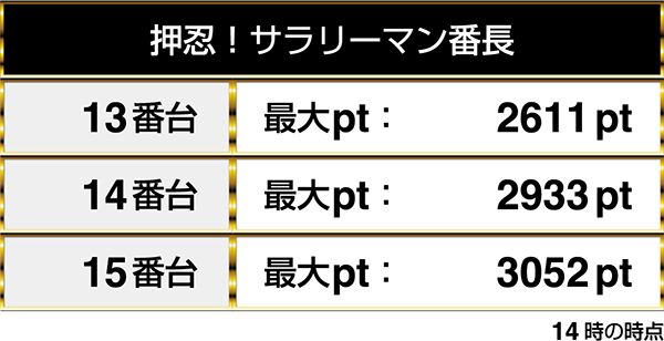 『押忍!サラリーマン番長』にも笑顔が連なり、13番台から15番台までの3台が2000ptオーバー!