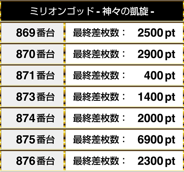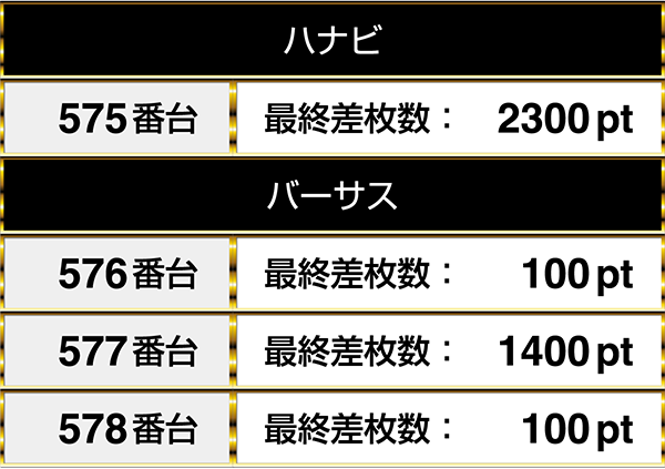 最終的には2箇所に3台以上の並びでプラスptを記録する場所があり、そのうちの5台が2000ptオーバー!!